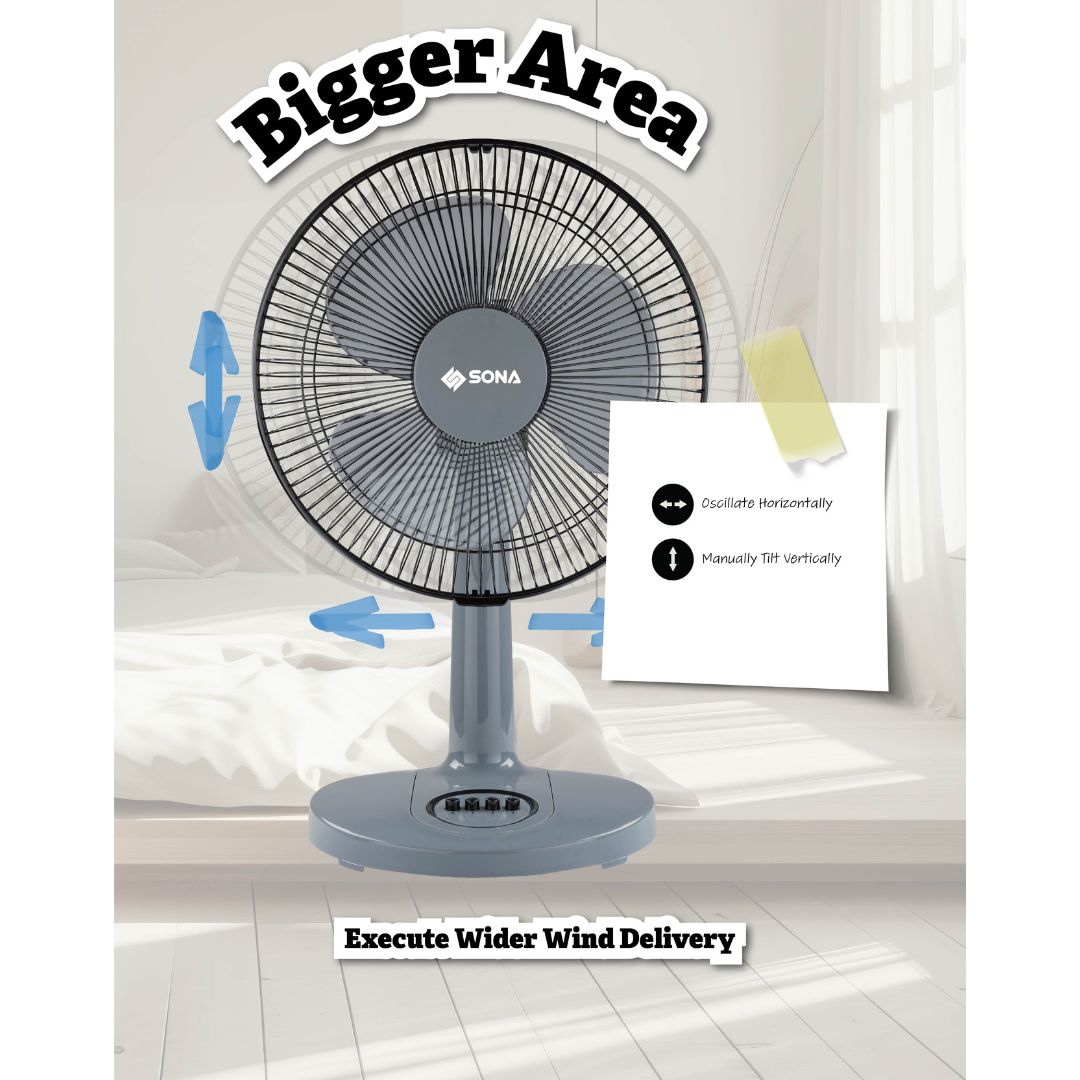 The SONA Desk Fan features a durable 40W full copper coil motor, transparent AS blades, 3 speed selections, left-right oscillation, and a free neck design for easy tilting adjustment.