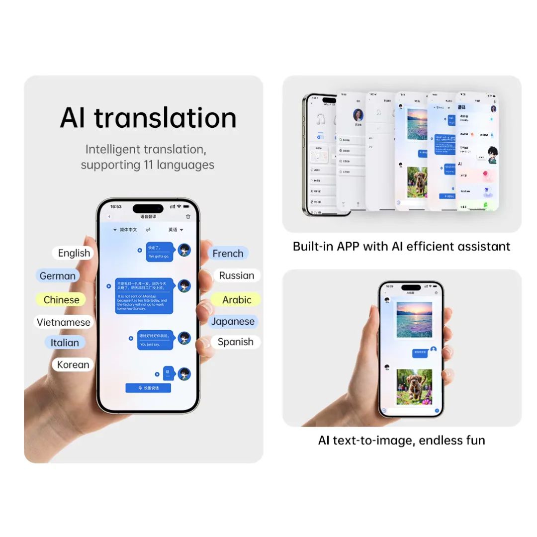 • AI Translation: Voice & text, 40+ languages, DeepSeek enabled