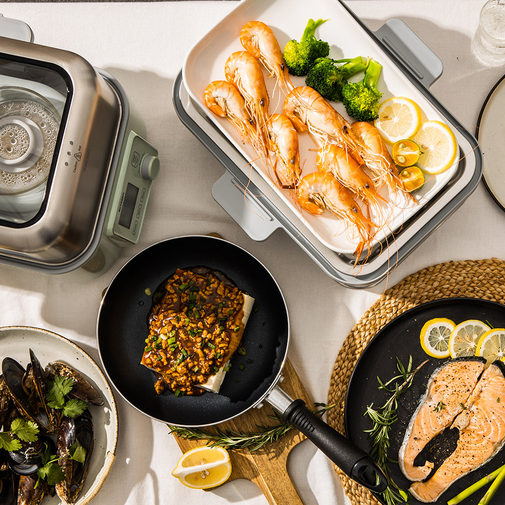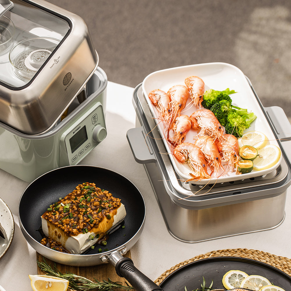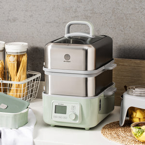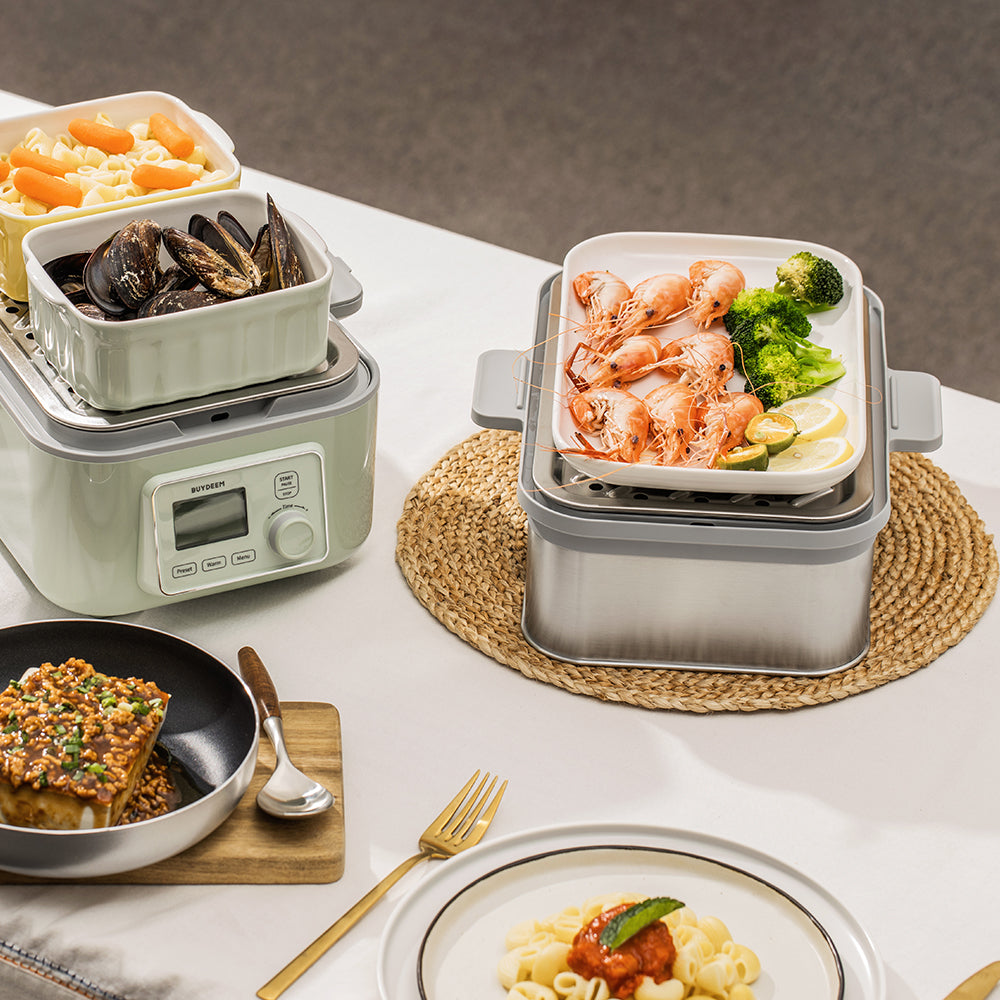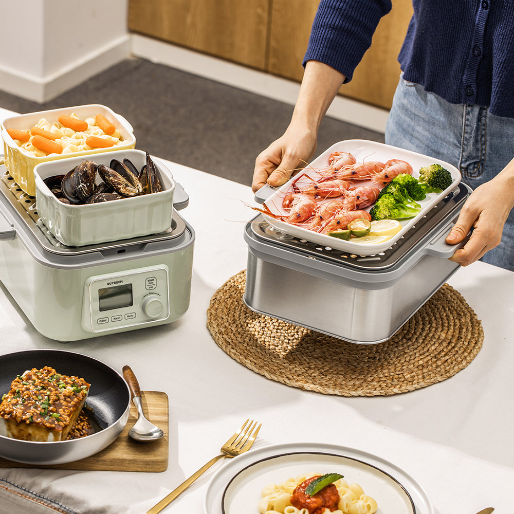 - Extra-wide double-tiered design allows you to separate and simultaneously cook 2 types of food. A removable stainless steel tray holds more and larger food, whether it's a whole chicken or a steamed cake, perfectly cooks food to the desired tenderness.