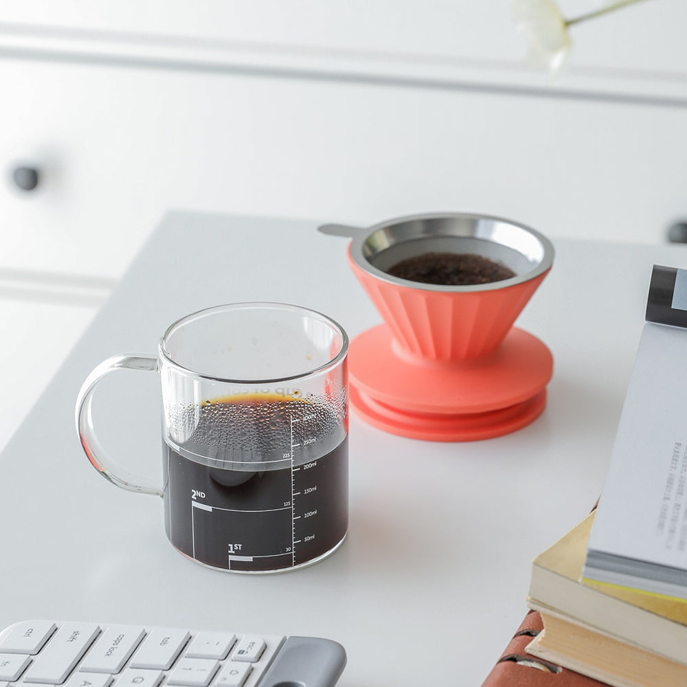Durable silicone, stainless steel, and borosilicate glass resist high temperatures and damage. Easy to read scales allow users to easily read measurements. Versatile cup for creating a variety of beverage recipes. Beginner-friendly so that everyone can enjoy pour-over coffee. Double-layer ultra-fine mesh filters coffees as good as traditional paper filters. Lightweight design is great for home, office, and even outdoor use