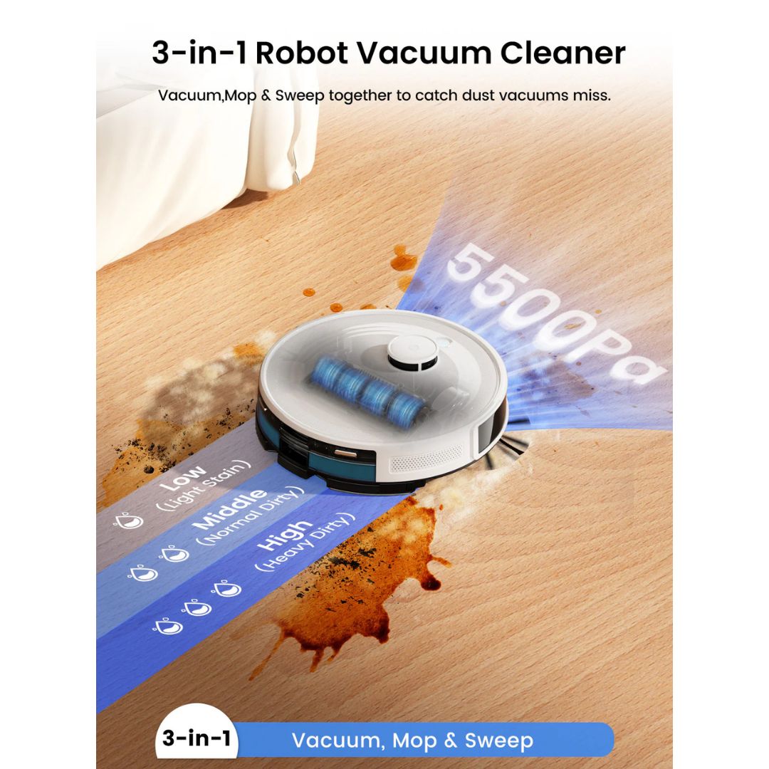 • Powerful 6000Pa Suction & 2-in-1 Vacuum + Mop: Deeply cleans dust, dirt, and pet hair. Includes a 300ml water tank with 3 adjustable water levels via app.