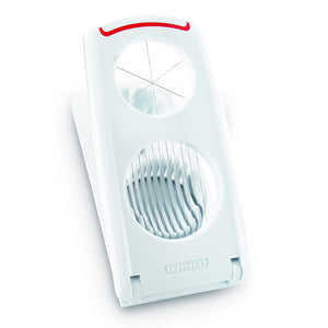 Three functions in only one device: the Leifheit ComfortLine egg cutter Combi cuts eggs in a flash into oval and round slices or cuts them into regular wedges. The rustproof cutting wire of stainless steel enables the neat and exact cutting of every slice — whether eggs, mushrooms, kiwis or potatoes boiled in the jacket.
