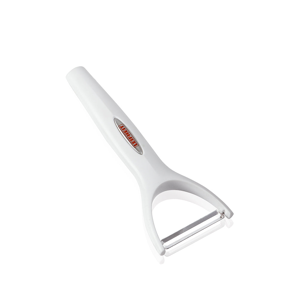 The Leifheit kitchen helpers with the comfort handle. The two-zone handle of the Y-peeler is made of two plastics, which complement each other excellently. The white plastic enables stability, cleanliness and hygiene. The soft zones in trendy red are there, where power reacts while using and the particular non-slipping is important. They prevent from slipping even with wet hands and offer a pleasant grip feeling. With practical eyelet for hanging for the separately available ComfortLine hook rail.