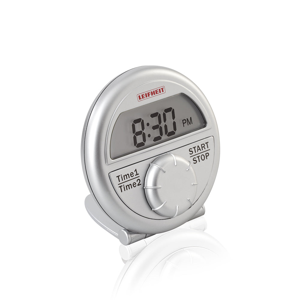 A successful meal is always a question of a good timing. From now on, the Leifheit digital kitchen timer enables perfect cooking times. The special feature: the digital timer measures two times parallel. It is as easy to operate as an analogous kitchen timer. Simply adjust the countdown with the rotary knob, ready. The base of the timer has a joint for the individual adjustment of the angle of inclination of the display to improve again the legibility of the large numbers. With clock function.