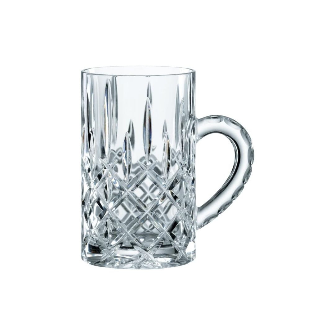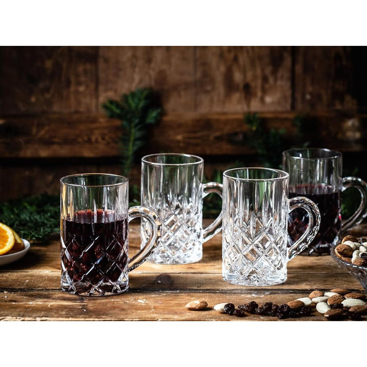 The Hot Beverage Glass is an elegant way to enjoy your favourite hot drink. This straight-sided glass features sturdy sides and a practical handle. It is ideal for enjoying warm drinks like tea, hot chocolate or coffee with a luxurious twist thanks to its cut-crystal design. The Noblesse series brings a touch of luxury to your home and celebrates the revival of classic design. Beautifully cut from the finest crystal, the products are a must have for anyone who wants to bring new luster to their home. Machine-made and dishwasher safe. This set contains 4 Nachtmann Noblesse Glogg / Mulled Wine glasses. Capacity: 250ml.
