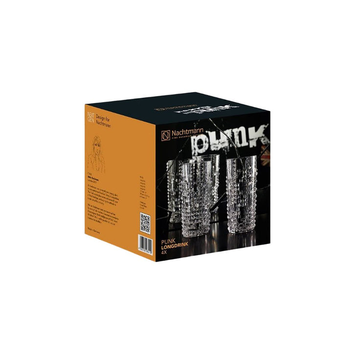 This set contains 4 pieces Nachtmann punk long drink glasses. The sparkling machine-made long drink glass of the cheekily abrasive glass collection Punk is unlike anything seen before in glass. The long drink glass is the right choice to enjoy any kind of cold alcoholic and non-alcoholic beverages. Nachtmann Punk dusts off the concept of traditional crystal homewares and marks its continued evolution into a modern and functional product. This item is dishwasher safe.