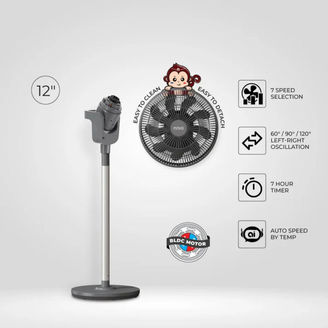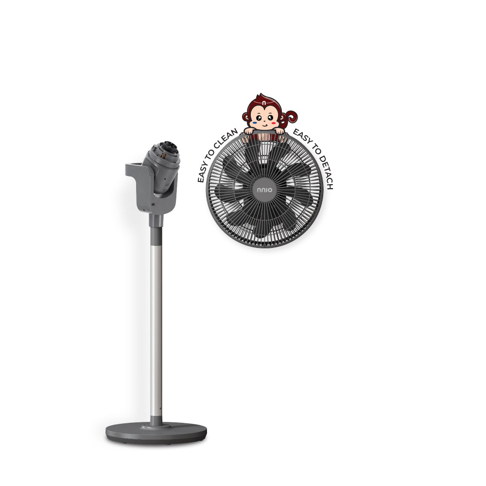 Experience effortless comfort with the NNIO EZ88 BLDC Stand Fan. Featuring powerful yet quiet airflow, AI temperature sensing, wide oscillation and easy remote control. Its one-twist detachable fan guard simplifies cleaning. Designed for different situations, it easily switches between a stand fan and a table or floor fan.