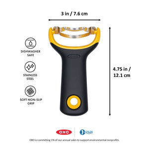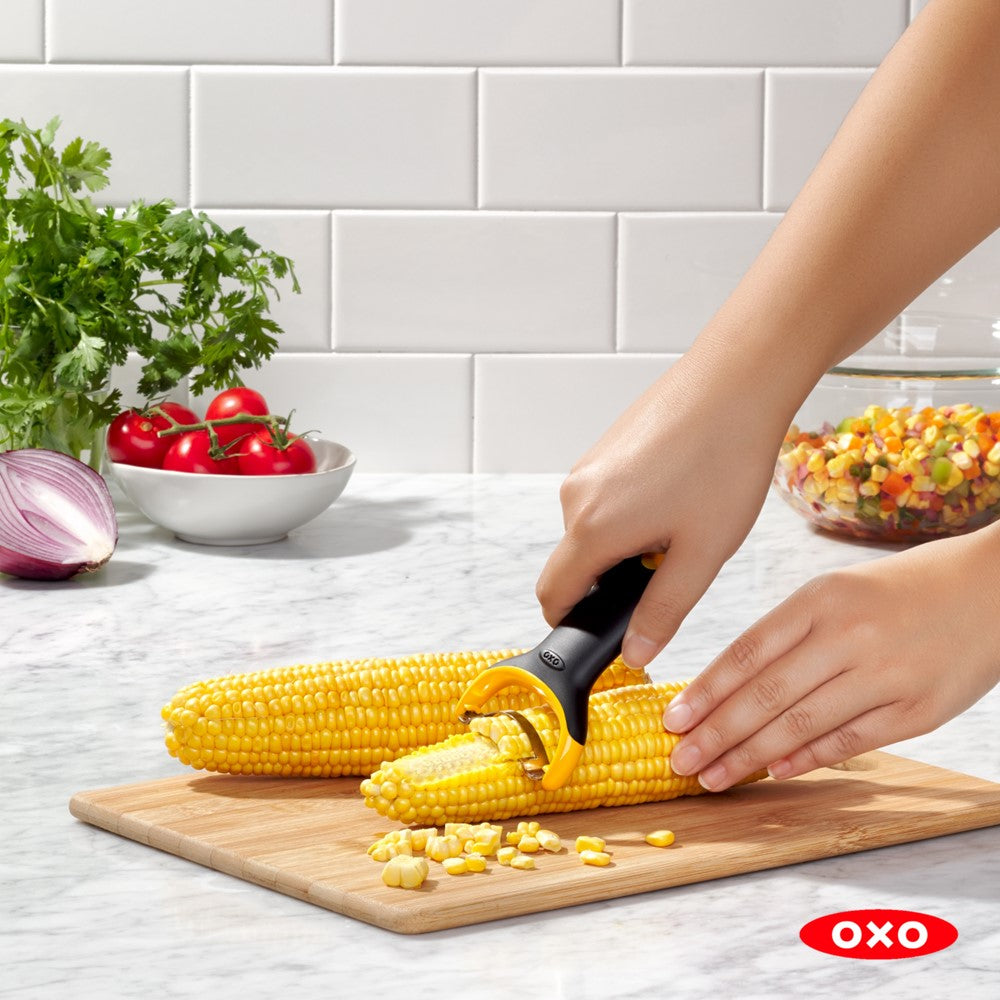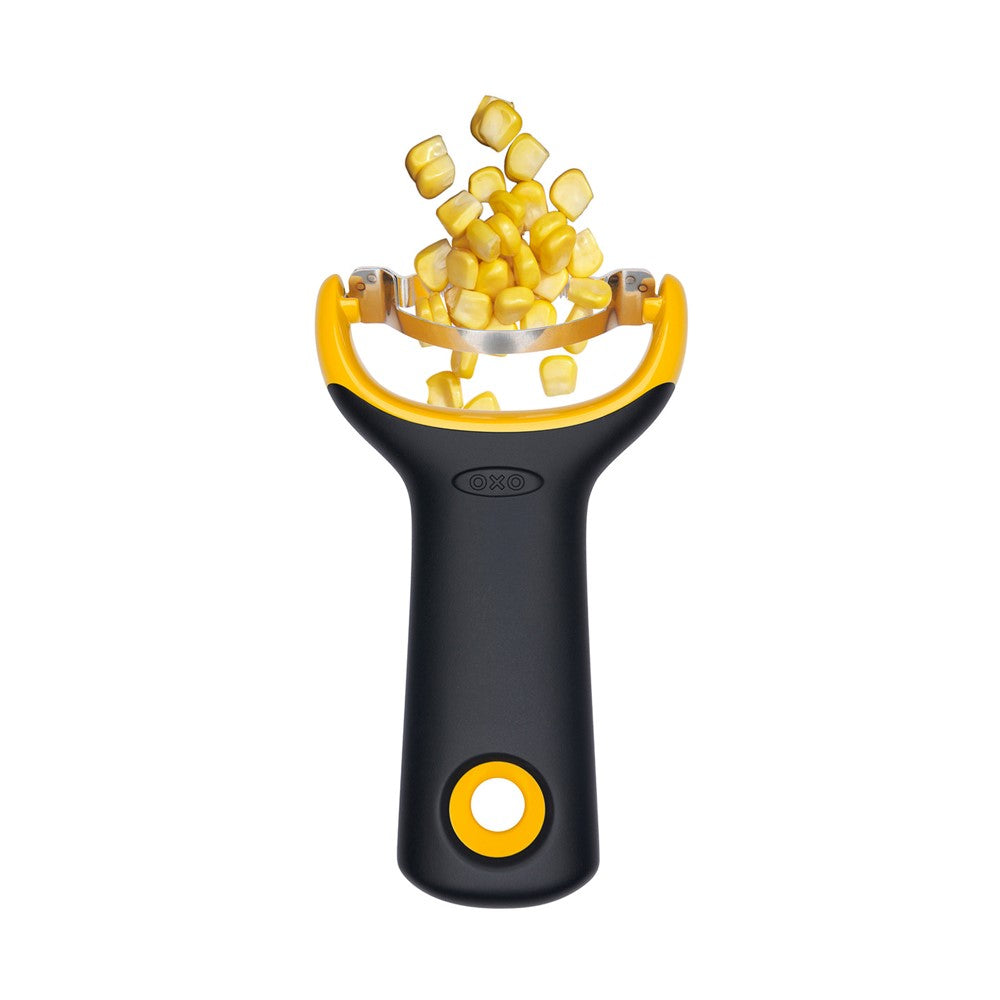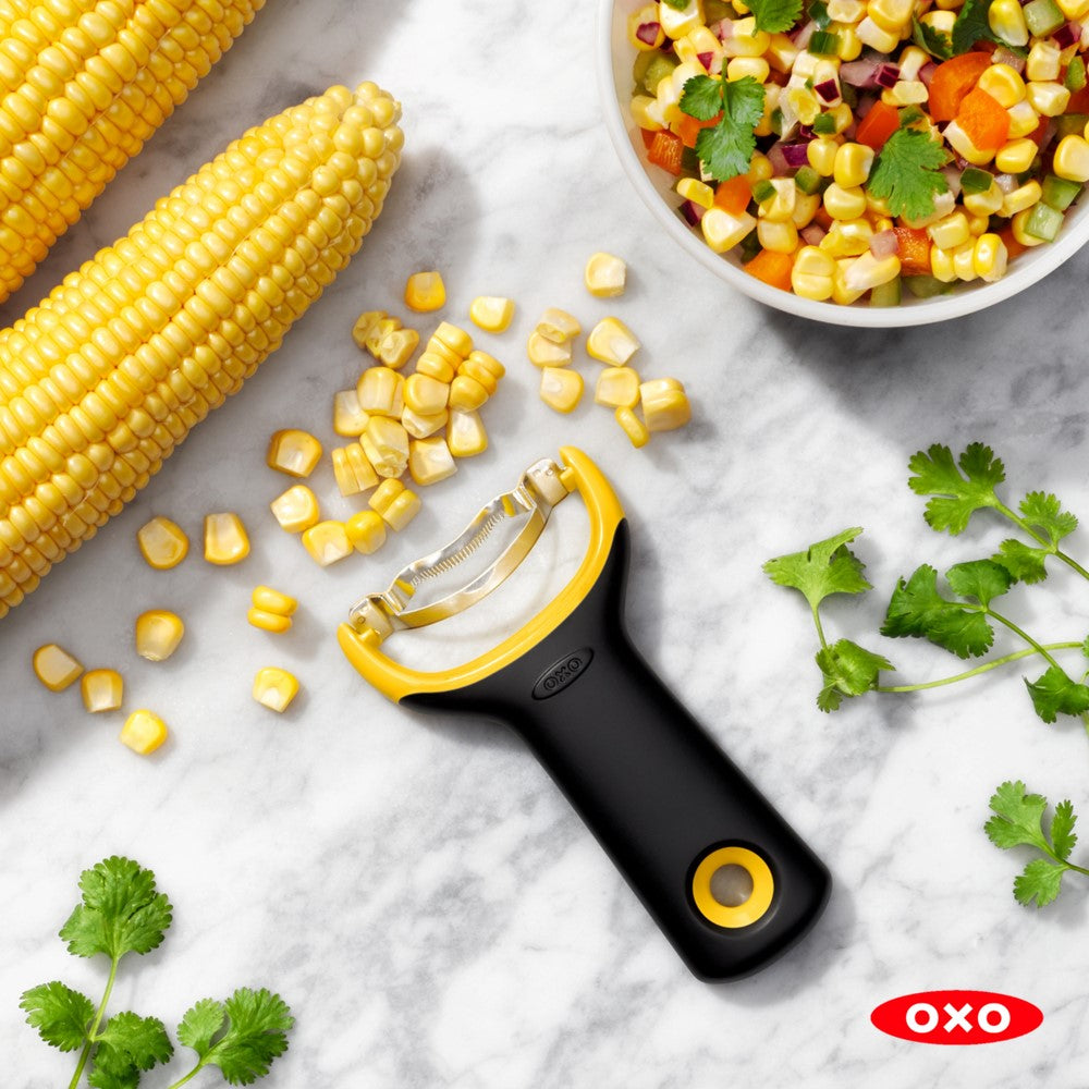 - Quickly and safely remove corn kernels from cobs with the OXO Good Grips¾ Corn Prep Peeler