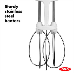 - Beaters are elevated so they work while device rests on bottom of bowl