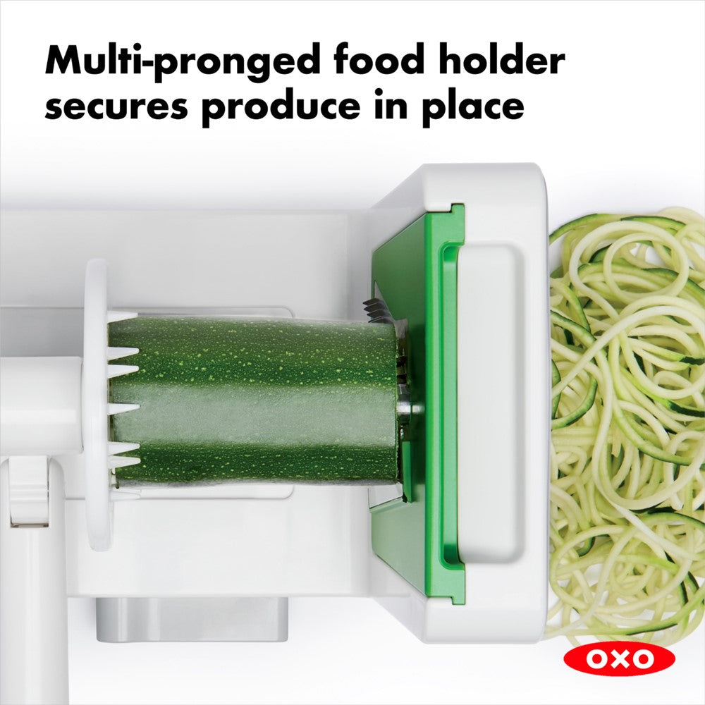 - Side handle advances fruits and vegetables through blades and folds up for compact storage