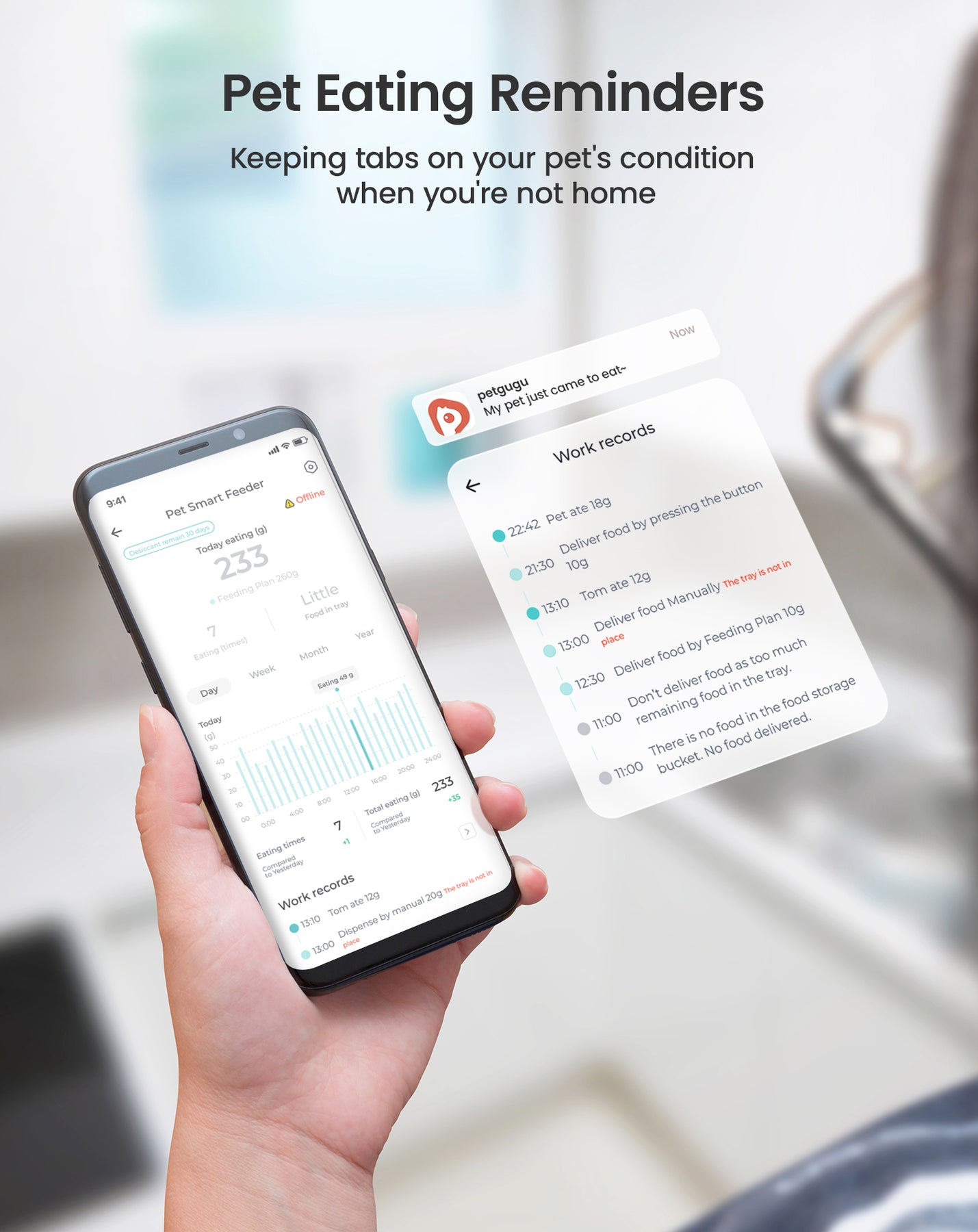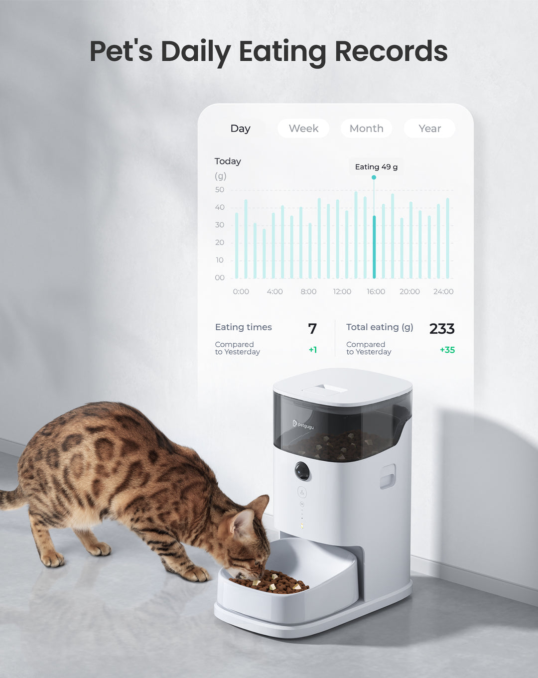 Real-Time Tracking Through Petgugu's Application: Petgugu Smart Feeder With Camera For Cats & Dogs features a mobile application that records the time your pet eats, the frequency, how many grams of food were consumed, and is able to compare the data with previous entries.