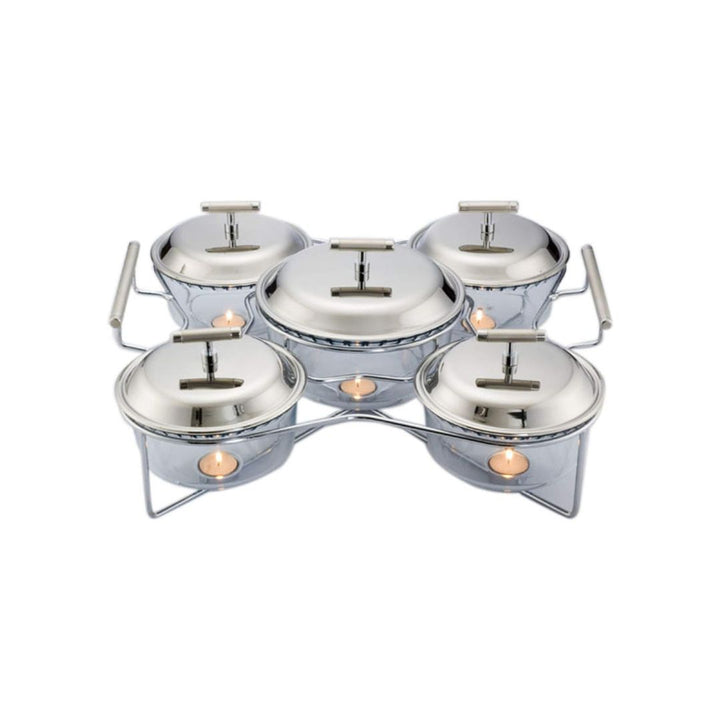 Food Warmer with Glass Bowl and 18/10 Stainless Steel Lid with 3l Glass. Borosilicate Glass-Thermal shock resistant, Hygienic material. Do not use: Hot dishes on cold /wet surfaces :cold liquids in hot dish on top of stove. Made In France - High quality .Size : (4pcs x 1.5L + 1pcs x 2.5L)