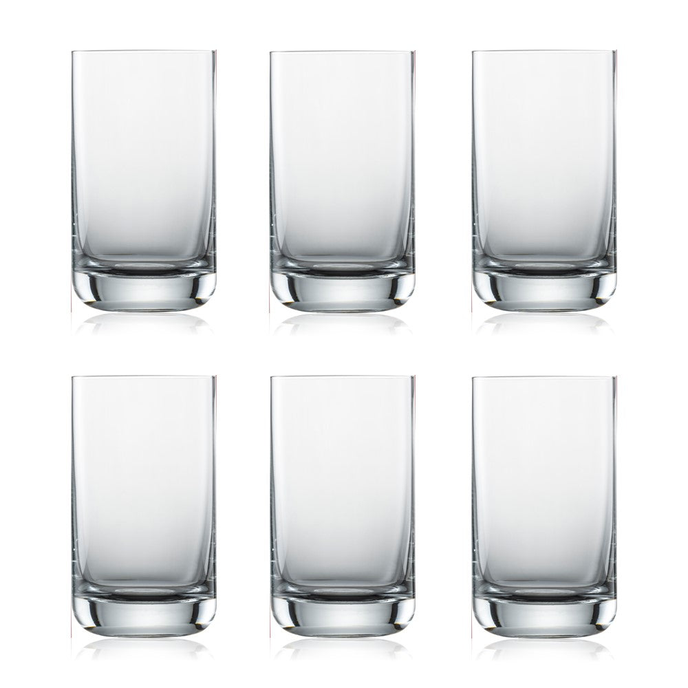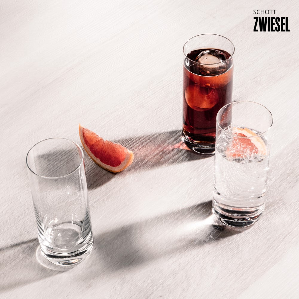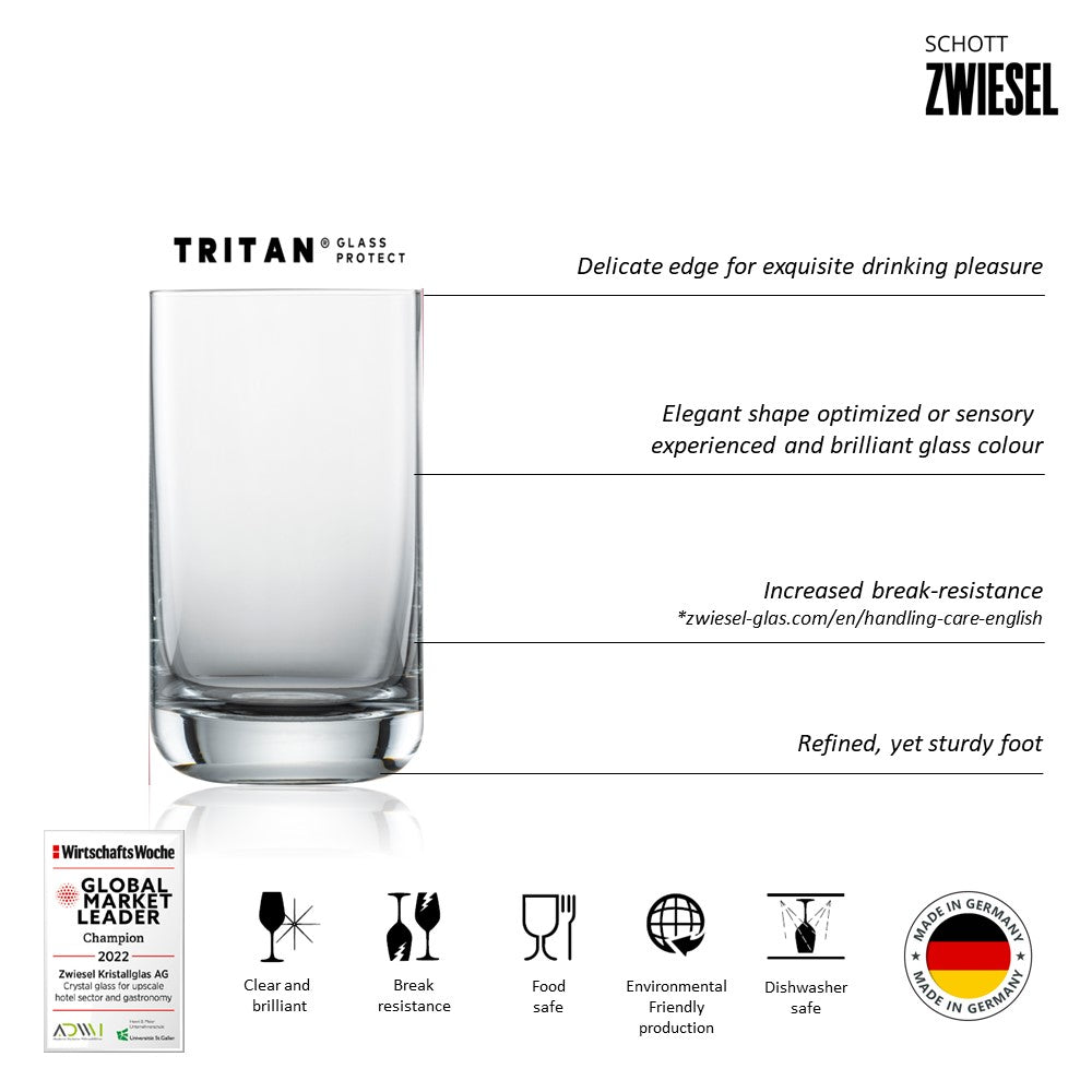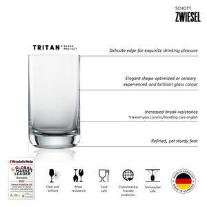Designed straight and robust Convention by Schott Zwiesel matches each ambiance. In the gastronomy as well as at home Convention convinces in form and function. In addition to the short-stemmed wine goblets, there are tumblers of different sizes with extra thick bottoms for cocktails and longdrinks. The patented break-resistant TRITAN® crystal glass is especially brilliant, resistant to breakage, and dishwasher safe.