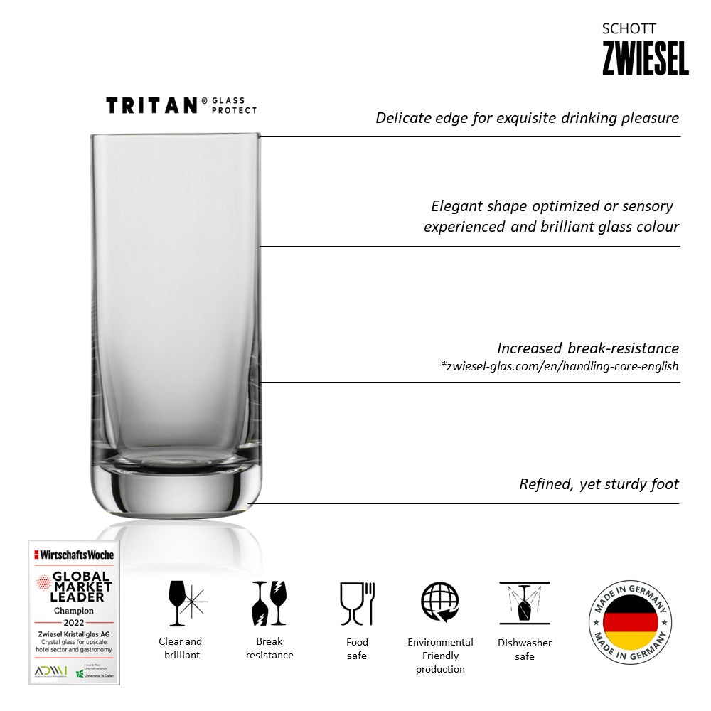 Designed straight and robust Convention by Schott Zwiesel matches each ambiance. In the gastronomy as well as at home Convention convinces in form and function. In addition to the short-stemmed wine goblets, there are tumblers of different sizes with extra thick bottoms for cocktails and longdrinks. The patented break-resistant TRITAN® crystal glass is especially brilliant, resistant to breakage, and dishwasher safe.