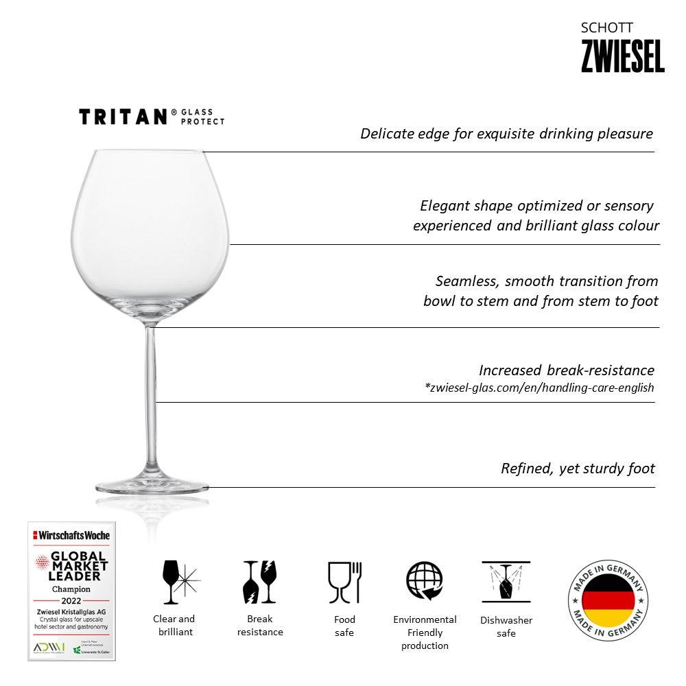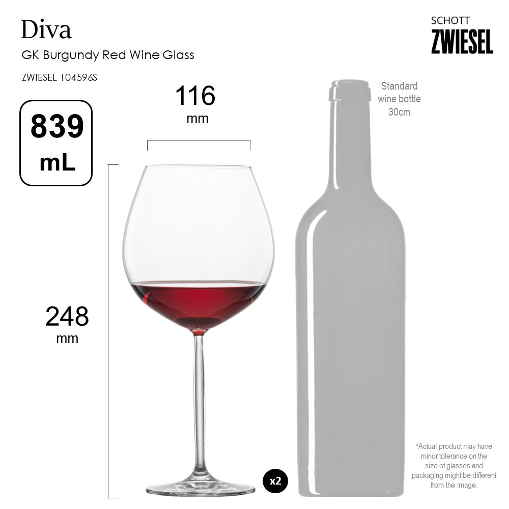 The set of 2 Schott Zwiesel DIVA collection Burgundy red wine glass makes a perfect gift. The Diva Burgundy Red Wine Glass is a perfect fit for Burgundy Red Wine, Pinot Noir, Beaujolais, C™tes de Nuits, C™tes de Beaune, Gevrey-Chambertin, Nuits-Saint-Georges, Vosne-RomanŽe, Chambolle-Musigny, Morey-Saint-Denis, Pommard, Volnay, Meursault, Puligny-Montrachet, Chassagne-Montrachet, Corton-Charlemagne, Pouilly-FuissŽ, Chablis and Sancerre.