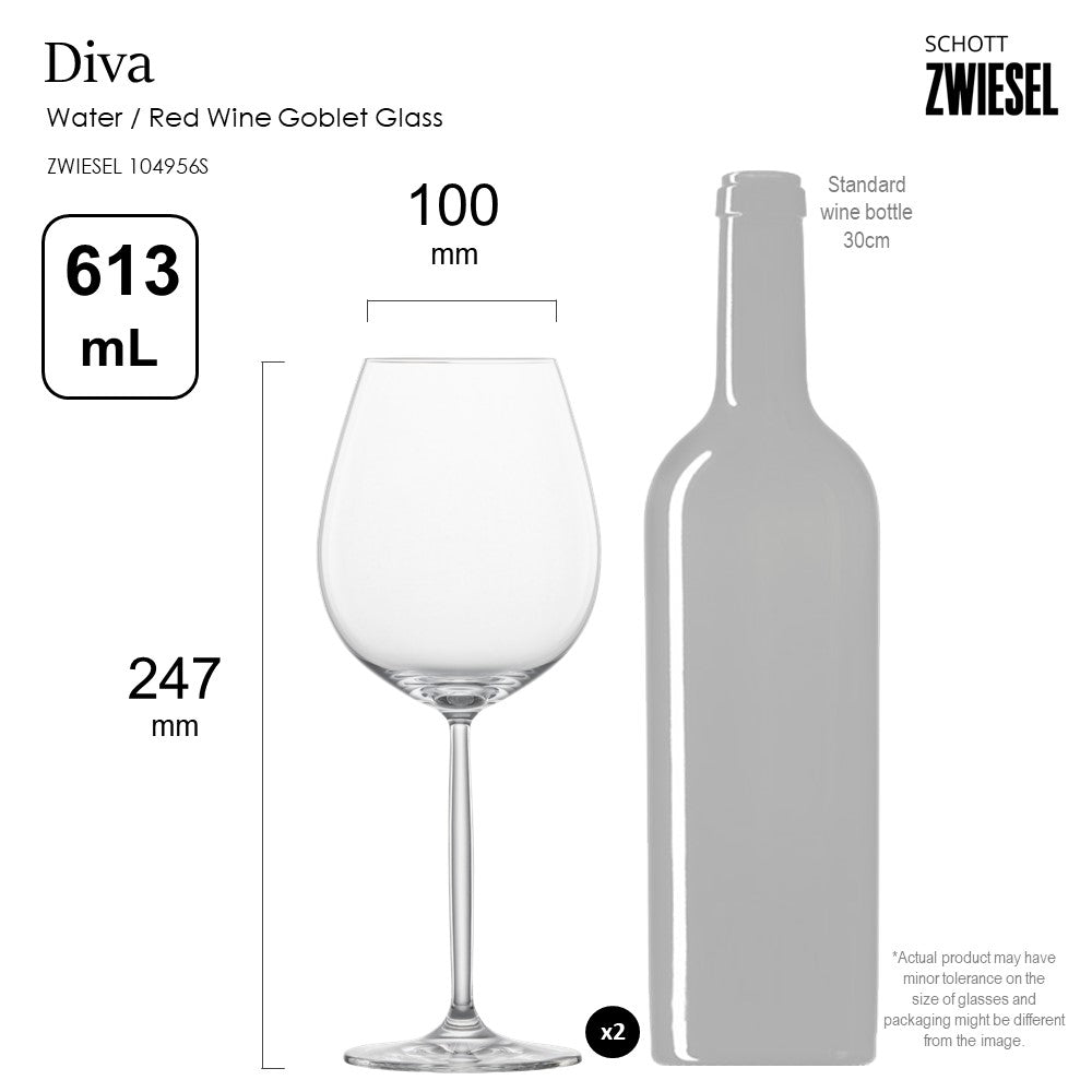The set of 2 Schott Zwiesel DIVA collection water / red wine goblet glasses makes a perfect gift. The practical stemmed water and red wine glass of the Schott Zwiesel Diva series has two different purposes. Toast with water or aromatic red wine as the situation requires! The Diva Water / Red Wine Goblet Glass is a perfect fit for all kind of red wine or water.