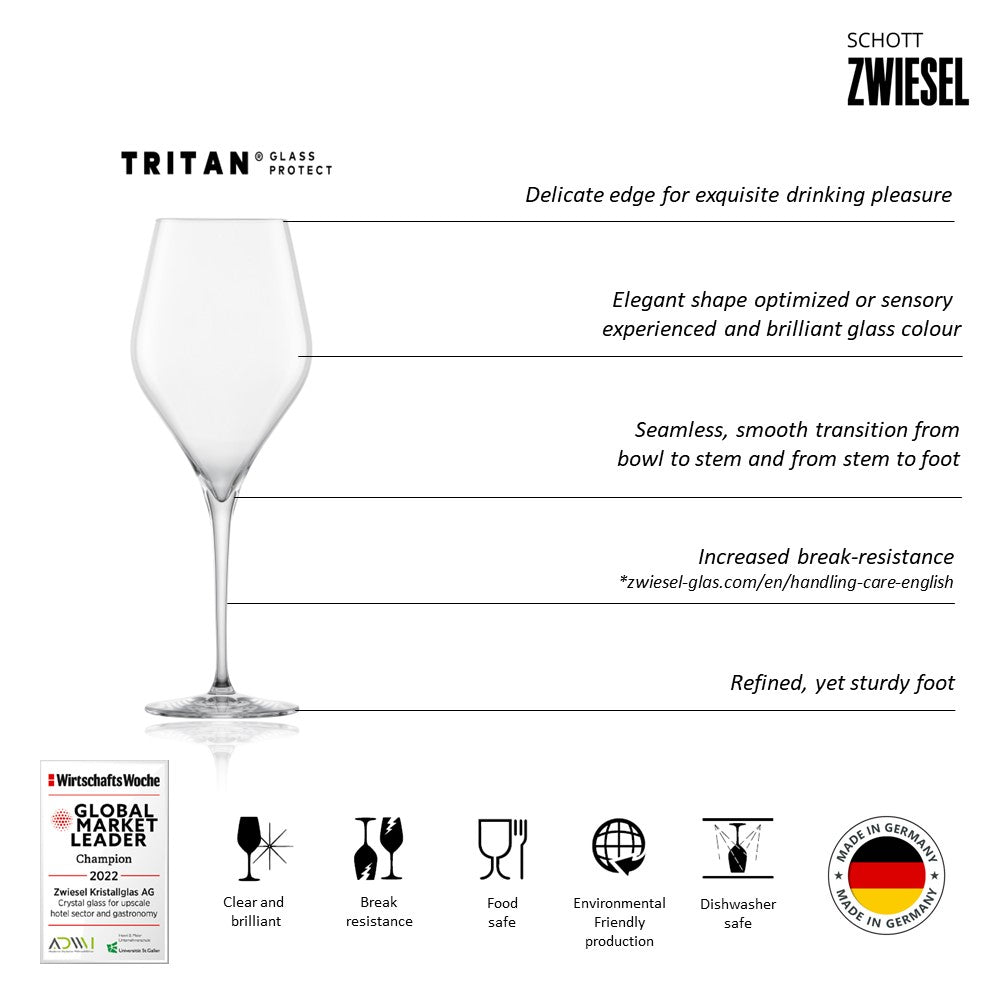 The Schott Zwiesel FINESSE collection Burgundy red wine glass is a perfect fit for Bordeaux Red Wine, Cabernet Sauvignon, Merlot, Malbec, Petit Verdot, Cabernet Franc, Syrah/Shiraz, Zinfandel, Pinot Noir, Rioja, Tempranillo, Chianti, Brunello di Montalcino, Barolo, Barbaresco, Amarone, Ch‰teauneuf-du-Pape, C™tes du Rh™ne, Gigondas and Saint-ƒmilion.