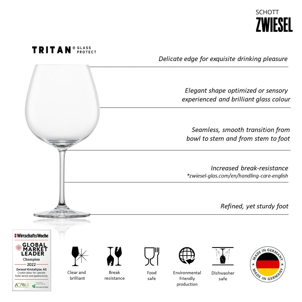 The Schott Zwiesel IVENTO collection Burgundy red wine glass is a perfect fit for Burgundy Red Wine, Pinot Noir, Beaujolais, C™tes de Nuits, C™tes de Beaune, Gevrey-Chambertin, Nuits-Saint-Georges, Vosne-RomanŽe, Chambolle-Musigny, Morey-Saint-Denis, Pommard, Volnay, Meursault, Puligny-Montrachet, Chassagne-Montrachet, Corton-Charlemagne, Pouilly-FuissŽ, Chablis and Sancerre.
