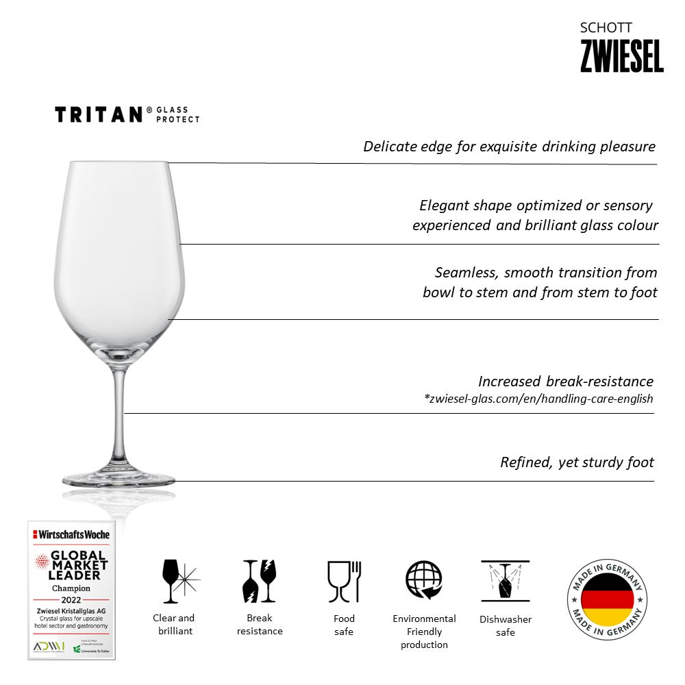 Our Schott Zwiesel Vi–a collection Claret red wine goblet is a great choice for enjoying exquisite Bordeaux. And, thanks to TRITAN® PROTECT technology, it is particularly sturdy as well. The Vi–a Bordeaux Red Wine Glass is a perfect fit for Bordeaux Red Wine, Cabernet Sauvignon, Merlot, Malbec, Petit Verdot, Cabernet Franc, Syrah/Shiraz, Zinfandel, Pinot Noir, Rioja, Tempranillo, Chianti, Brunello di Montalcino, Barolo, Barbaresco, Amarone, Ch‰teauneuf-du-Pape, C™tes du Rh™ne, Gigondas and Saint-ƒmilion.
