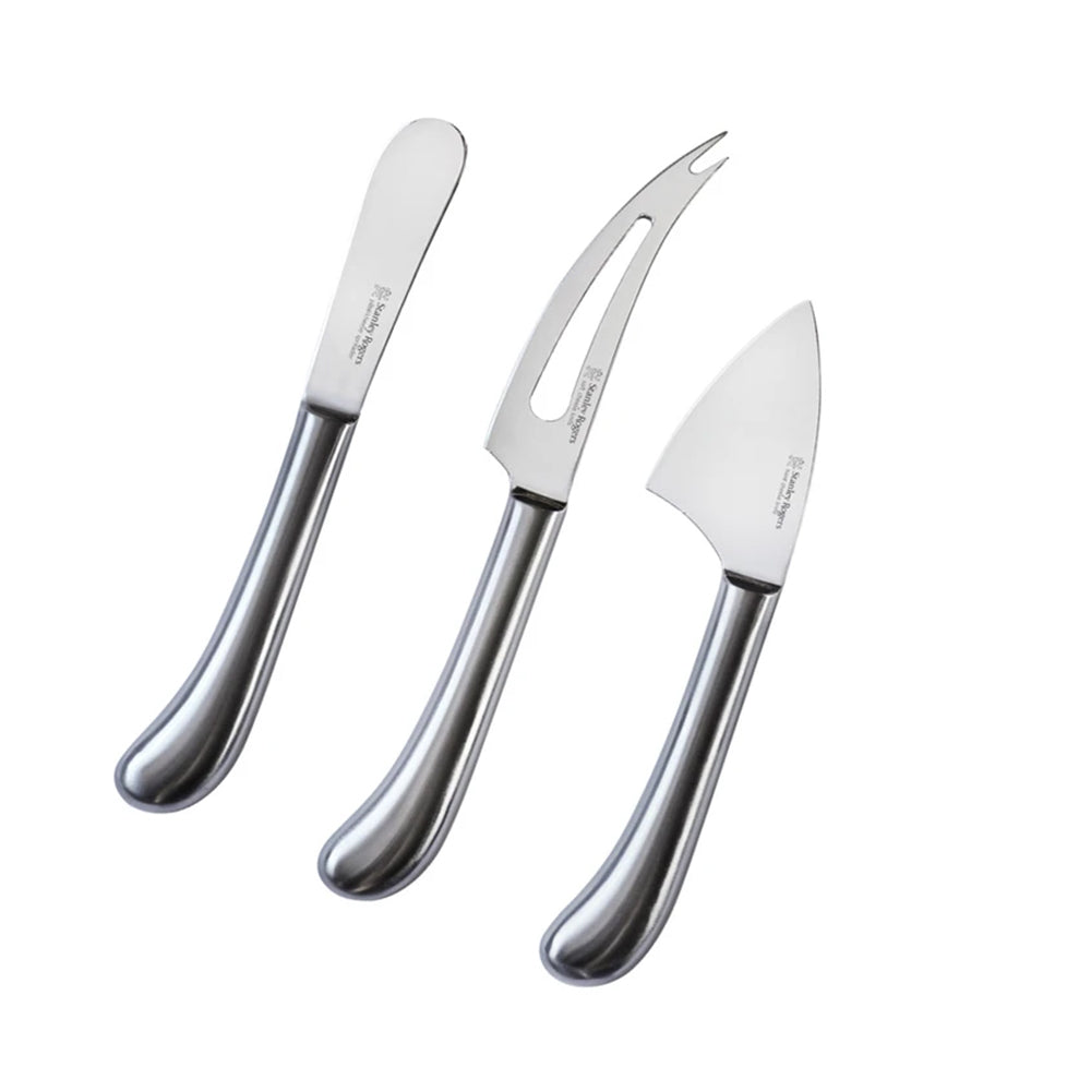 The most versatile cheese knives. The hole in the Soft Cheese Knife reduces cheese from sticking. The arched blade of the Hard Cheese Knife will cut through hard cheese with ease. Spreader is perfect for creamy cheeses and pâté. The hollow stainless steel handle feels substantial yet comfortable and balanced.