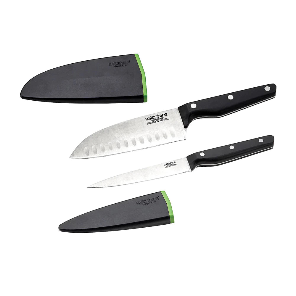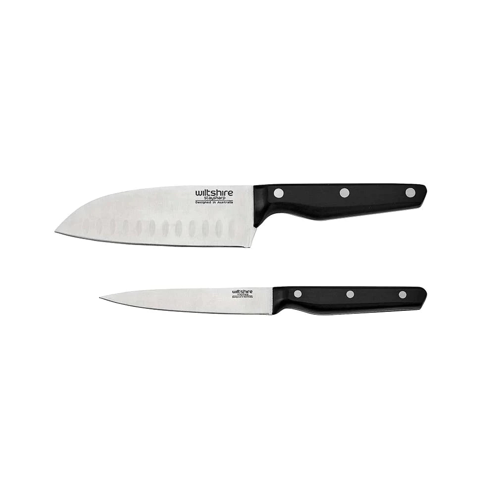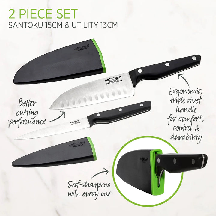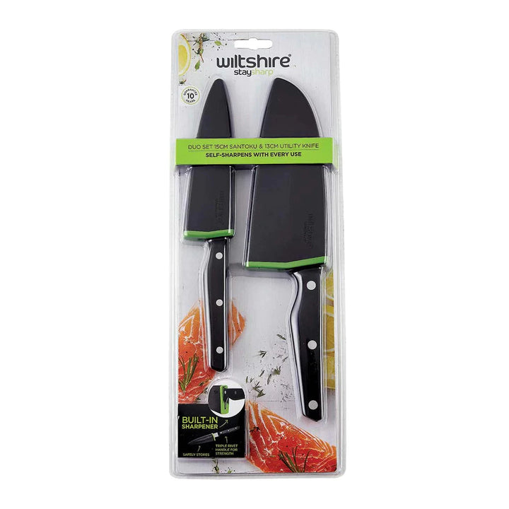 Think of the Staysharp Santoku Knife and Utility Knife as short cuts for everyday food prep. The Santoku Knife is comfortable with mincing, slicing dicing or chopping. The Utility Knife feels right at home cutting small fruit, vegetables and herbs. They’ll stay sharp, thanks to its clever self-sharpening technology. So it’s a partnership of all-purpose and precision. Quick and easy. Good looks and functionality. And if you think they’re perfectly matched, it makes two of us.