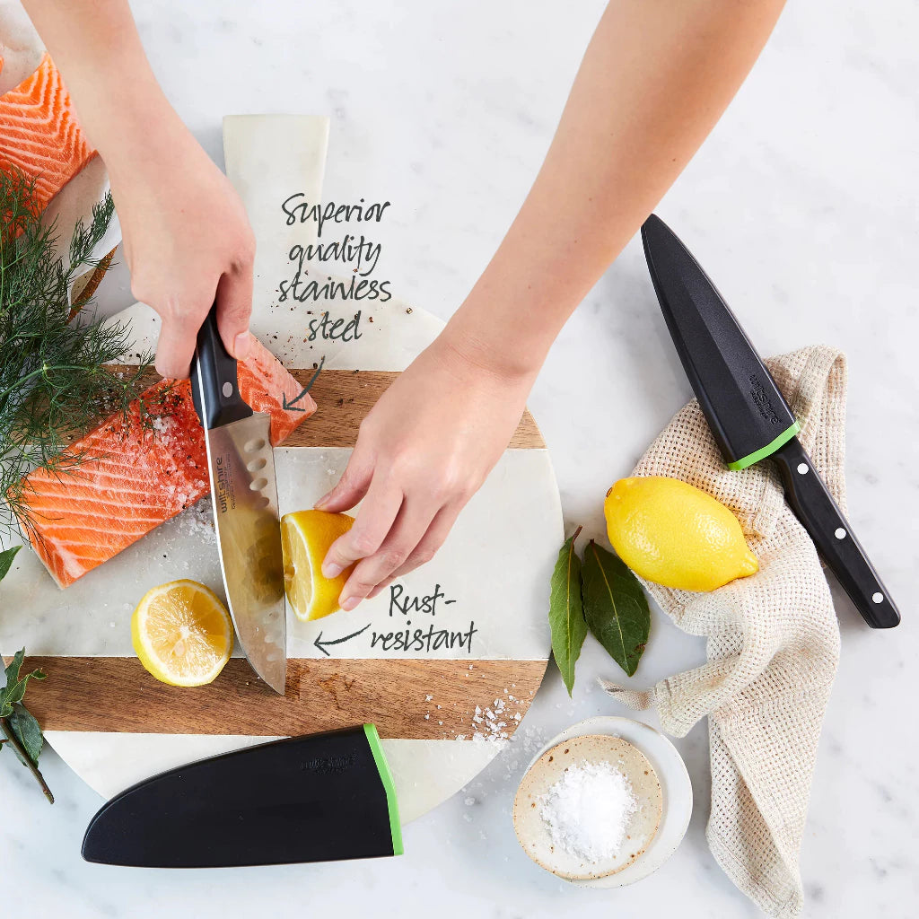 Let's face it. Good knife care makes lighter work of kitchen chores, and we're all for that! Dishwashers may be a godsend for everything else, but not your knives because detergent can cause corrosion and blunt your knives. It is best to hand wash with a soft cloth and dry immediately. Remove stains with a mild, non-abrasive cleaner and wash well before use. Always keep your Staysharp knife inside its scabbard.