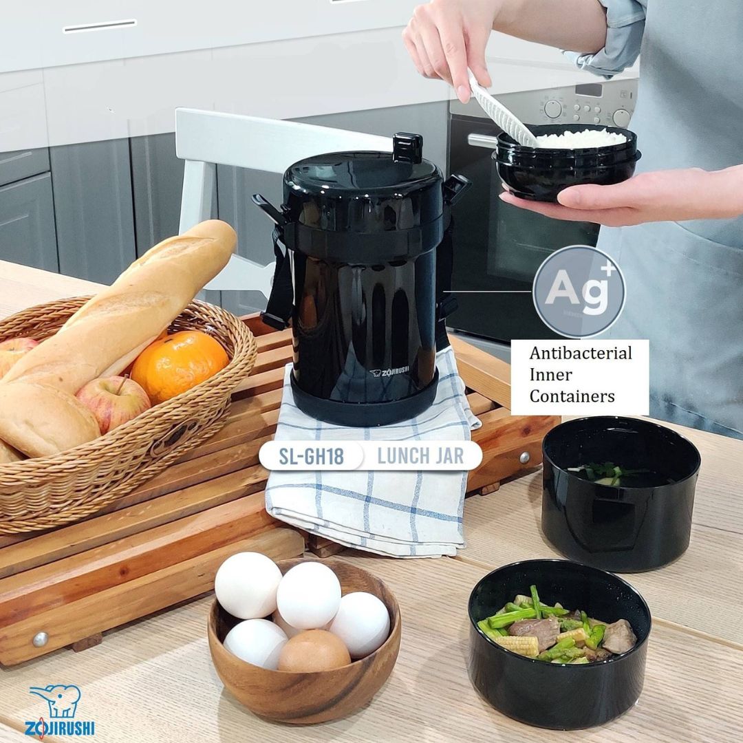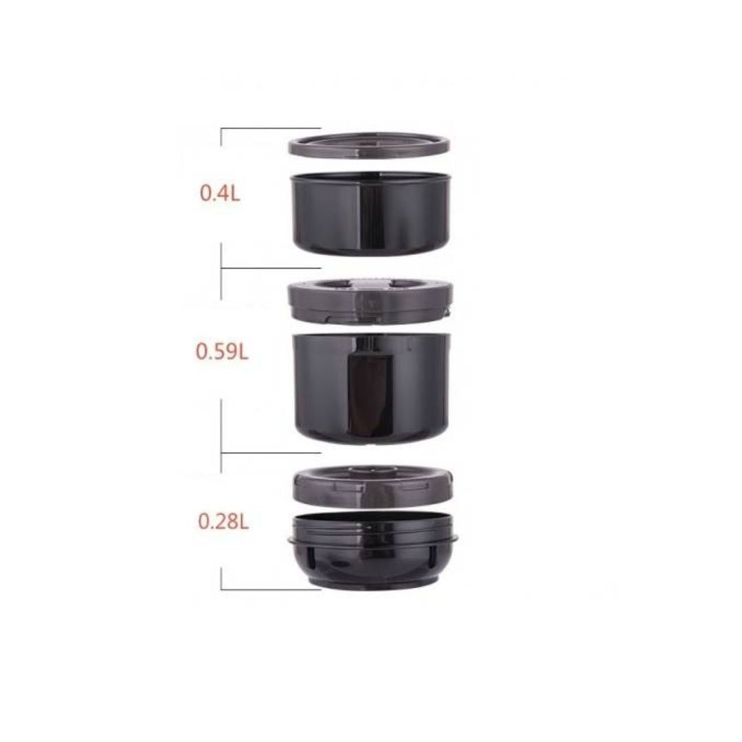 3 microwaveable inner bowls, Washable nonstick coated outer container, Includes chopstick with cover, Made of BPA-free plastic and stainless steel, Heat retention: 69°C @ 6hrs, Capacity: Rice: 0.59L, Food: 0.40L, Soup: 0.28L.