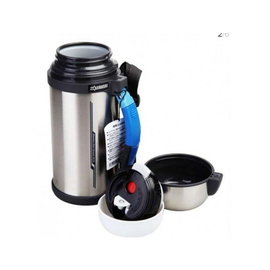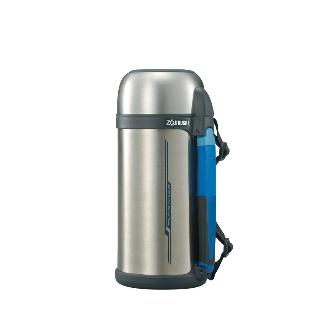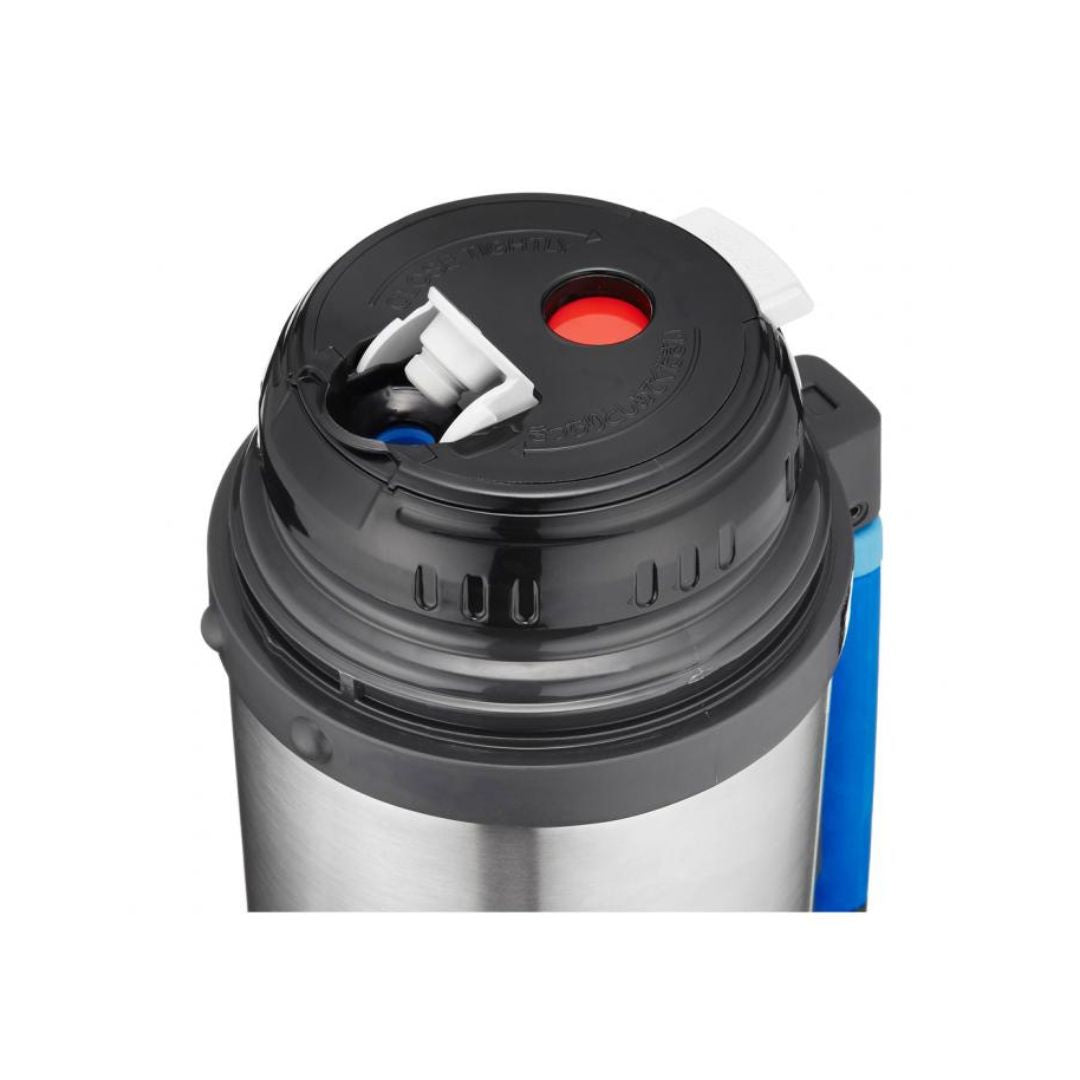 Stainless steel vacuum insulation keeps beverages hot or cold for hours, Extra wide mouth and easy-to-clean nonstick interior, One-touch pour-through stopper, Collapsible handle and carrying strap, Made of BPA-free plastic and stainless steel.