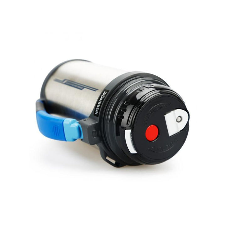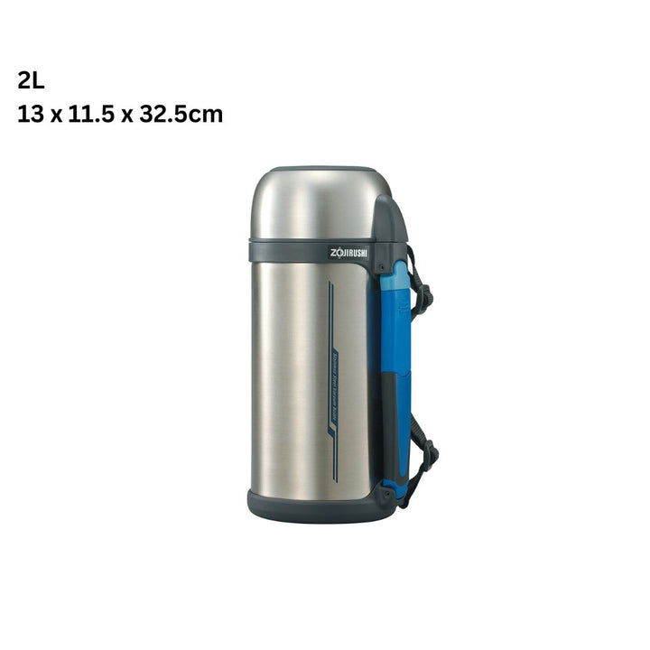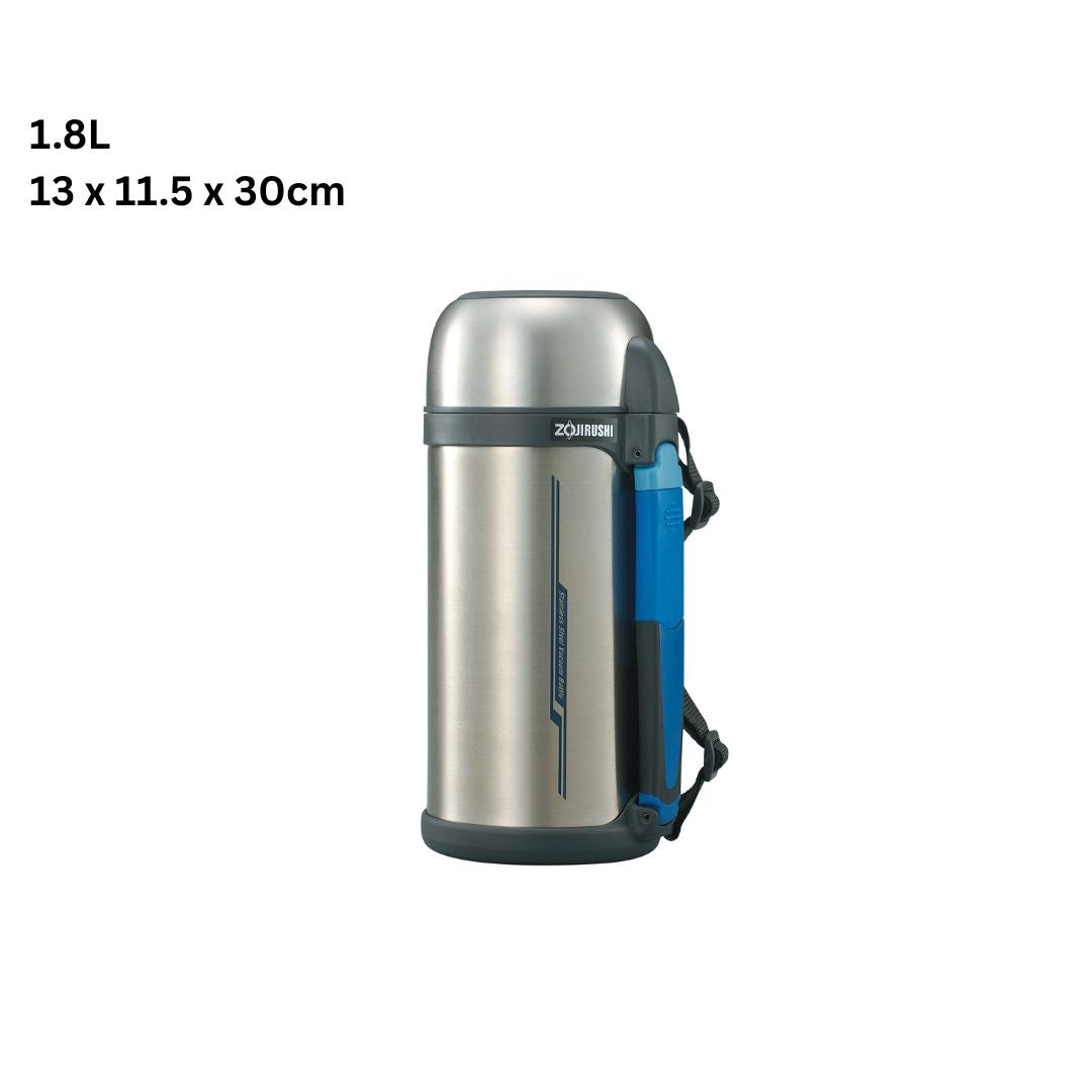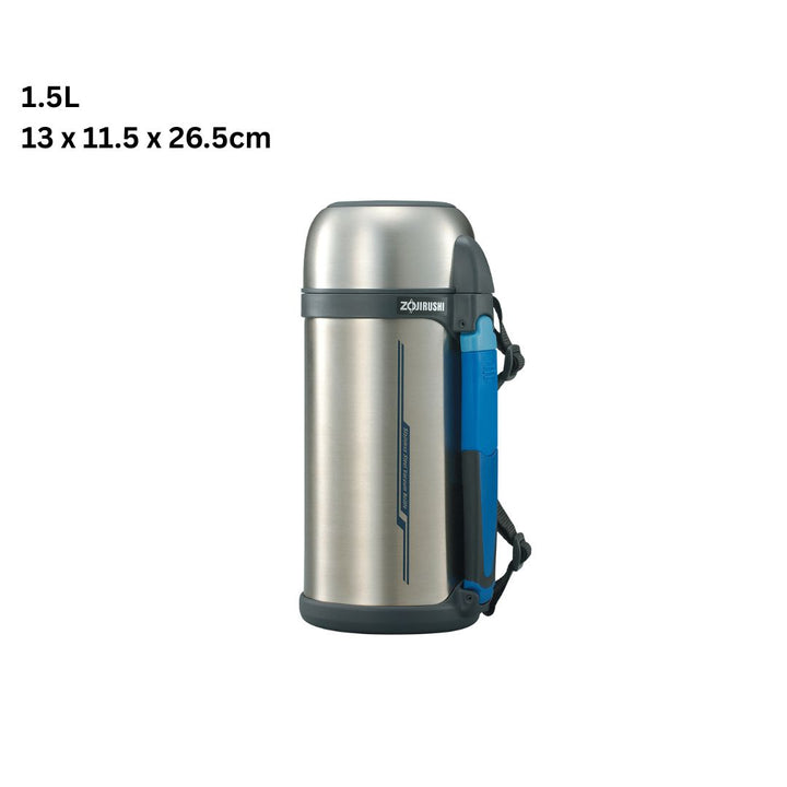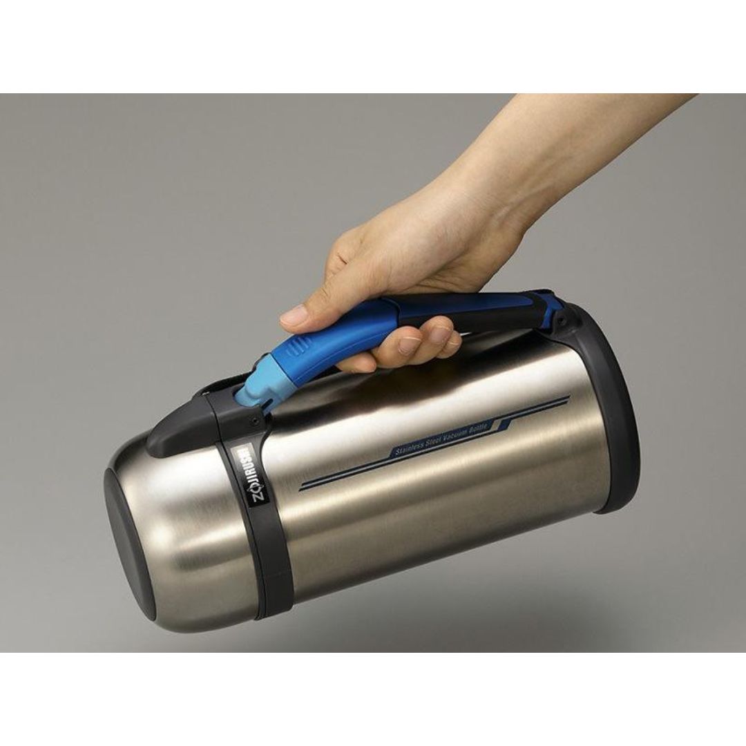 Stainless steel vacuum insulation keeps beverages hot or cold for hours, Extra wide mouth and easy-to-clean nonstick interior, One-touch pour-through stopper, Collapsible handle and carrying strap, Made of BPA-free plastic and stainless steel.