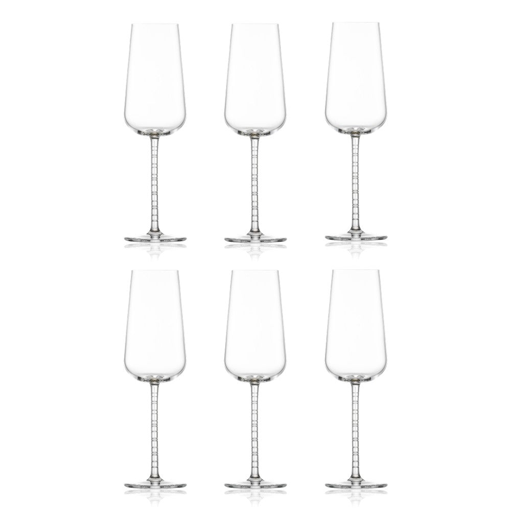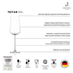 The highest standards of design, enjoyment, and texture come together in the elegant wine and champagne glasses featured in the Journey range. This unique range emerged from a partnership with renowned designer Sebastian Herkner. Feel the milestones in the 150-year history of Zwiesel Glas: raised linear relief pattern lines in the glass stems in this five-piece set symbolize the journey through the ages, connecting past, present and future. The unique feel of the stems and the thin-walled bowl of the Bordeaux, Burgundy, white wine, allround and champagne glasses, tested on the senses, make your guests' pleasurable occasions unique. Sustainably crafted in Germany. The patented break-resistant TRITAN® crystal glass is especially brilliant, resistant to breakage. Please handwash this product.